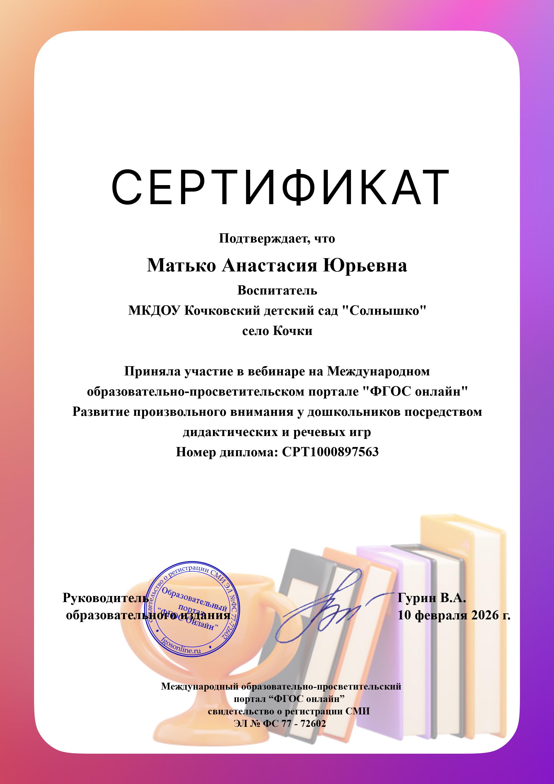 Сертификат участника вебинара на тему "Развитие произвольного внимания у дошкольников посредством дидактических и речевых игр". Февраль 2026 год.