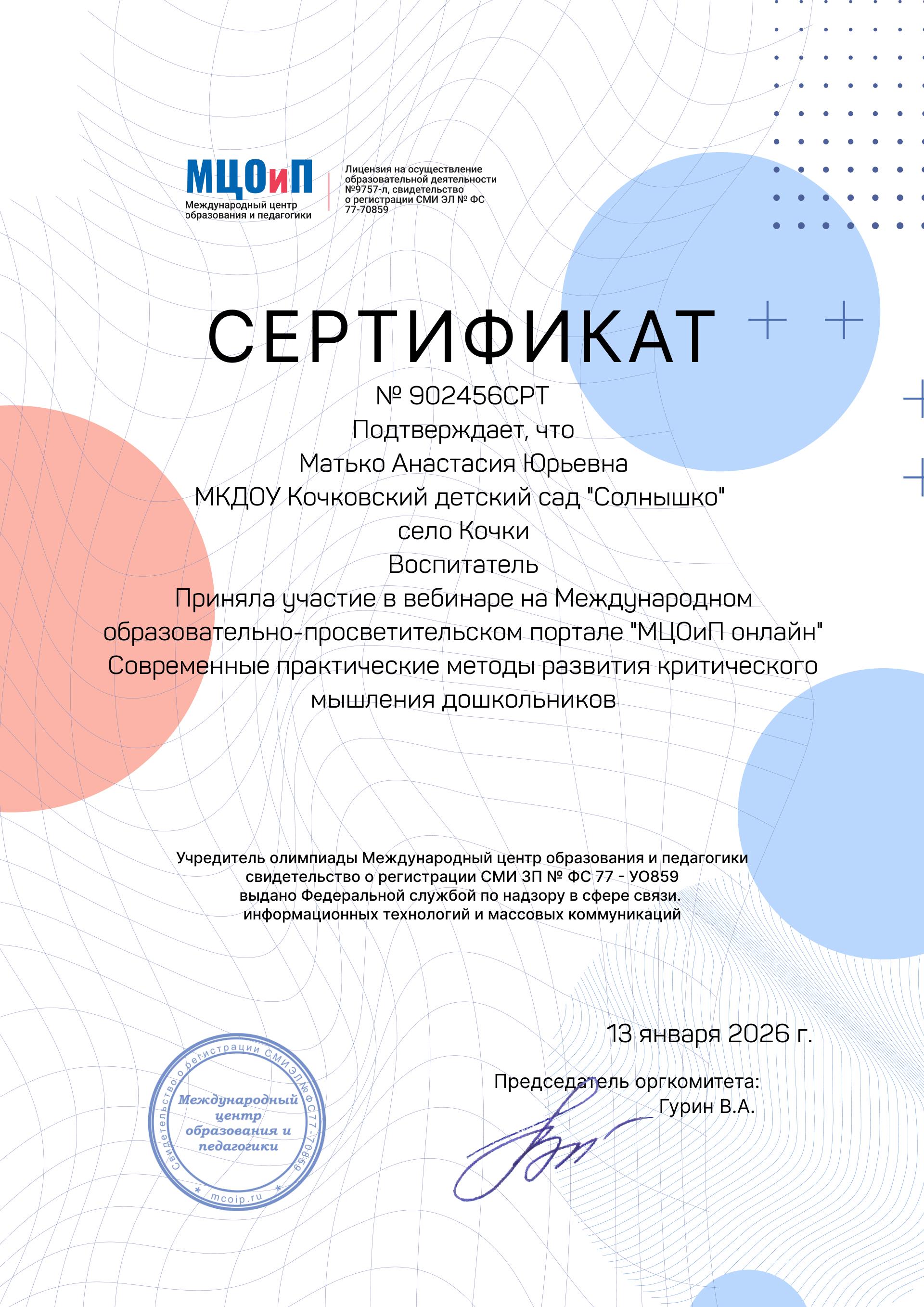 Сертификат участника вебинара на тему "Современные практические методы развития критического мышления дошкольников". Январь 2026 год.